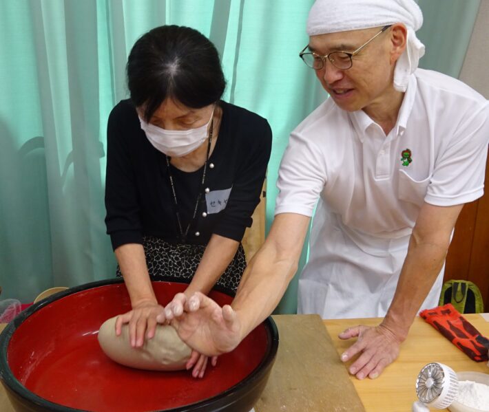 サロンでは「被災者との交流を深める」ことを重点に置き、「信州そば打ち(切り)体験」、「健康チェック」、「司法・行政書士相談」の企画にご希望に応じてご参加いただきました。「信州そば打ち(切り)体験」では、「水回し」「こね」「菊もみ」「へそ出し」と続き、生地を均一に広げてから麺棒で四角形に延ばし、最後に生地を畳んでから包丁で切るという本格的な工程を体験いただきました。切ったお蕎麦はお土産としてお持ち帰りいただき、厨房では前日に打ったそばを調理し、参加された皆様に振る舞いました。「本物の信州そばのおいしさを堪能してほしい」という思いから、出来上がったそばはすぐに召し上がっていただけるよう、連携プレーで頑張りました。