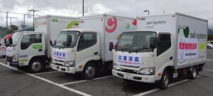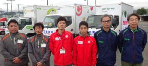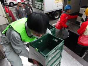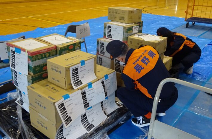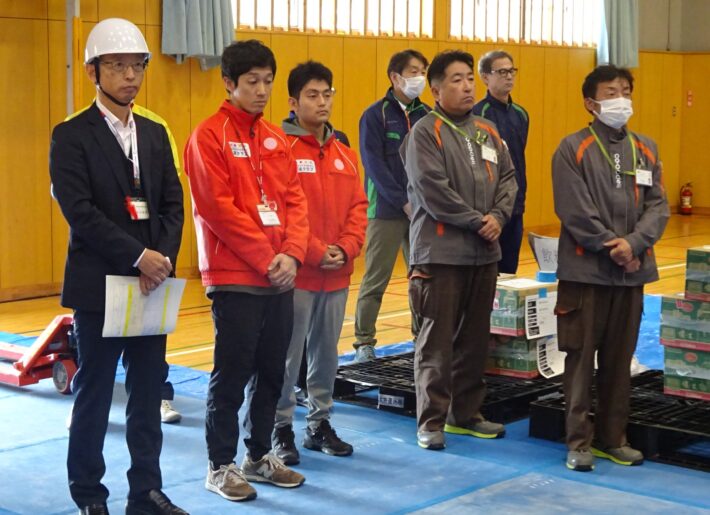県生協連からは岡谷市民総合体育館東体育館で行われた【物資輸送拠点運営訓練】に、コープながの、生活クラブ生協長野、パルシステム山梨長野の配送車が参加しました。今年は災害対策本部が避難所(岡谷南高校体育館)からの物資の要望を受けて、県に物資要請を行ったことを受けて、トラック協会と生協が緊急支援物資を物資拠点である岡谷市民総合体育館に物資を届け、検品を受けるという訓練です。その後、物資拠点では避難所へ届ける物資の仕分けを行い、赤帽トラックに積み込み、避難所へ届けるために出発するという一連の流れを確認しました。